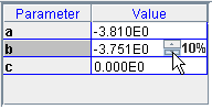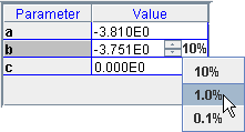 Adjusting fit parameters. To vary a parameter, click in its value cell as shown in Figure 5. Type in a new value, or use the up and down arrow buttons to increase or decrease the parameter value in increments equal to a fixed percent of its starting value. To change the increment size click the percent display and select from the popup choices.