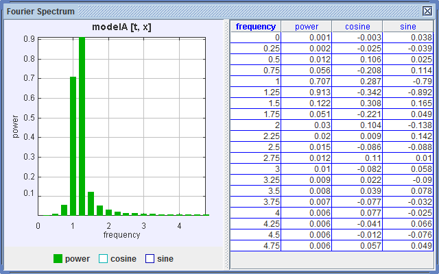 Fourier analysis is the representation of an arbitrary function as a sum of sines and cosines. Data Tool implements a Fast Fourier Transform (FFT) that converts a set of data with equally spaced x-values (often time) to a frequency spectrum that shows the amplitude of the sine component, cosine component and power as a function of frequency.